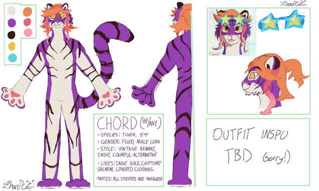 Hi, I'm ChordCat! I'm a furry, artist, cosplayer, and aspiring musician (I'll get there eventually, I swear).At the moment I'm into Crypt/Rift of the Necrodancer, Splatoon, Shadows over Loathing, and Deltarune.This site is mostly so I can keep track of my OC's, you can find them on the next page :]